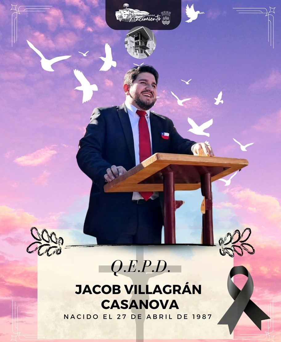 La Ilustre Municipalidad de Nacimiento, su alcalde Carlos Toloza Soto y el Honorable Concejo Municipal, junto al DAEM, expresan sus más sentidas condolencias a la familia, amigos y comunidad educativa por el sensible fallecimiento de Jacob Dagoberto Villagrán Casanova (Q.E.P.D.), destacado docente y director de la Escuela Canadá.