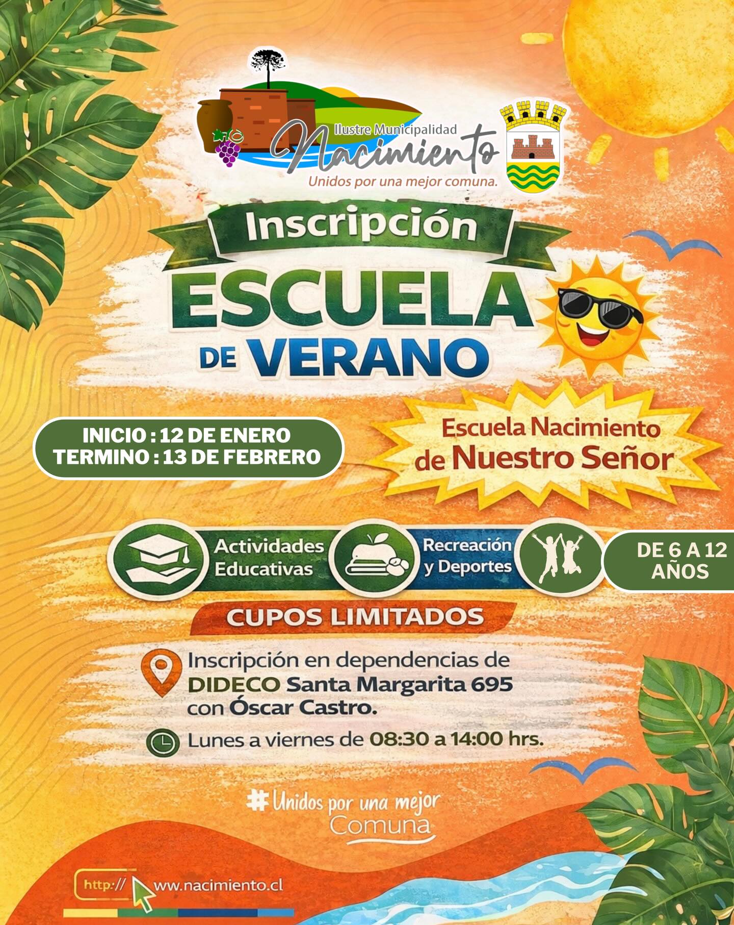 La Ilustre Municipalidad de Nacimiento invita a niños y niñas a ser parte de una entretenida y formativa Escuela de Verano, pensada para aprender, recrearse y compartir durante estas vacaciones.