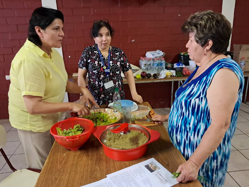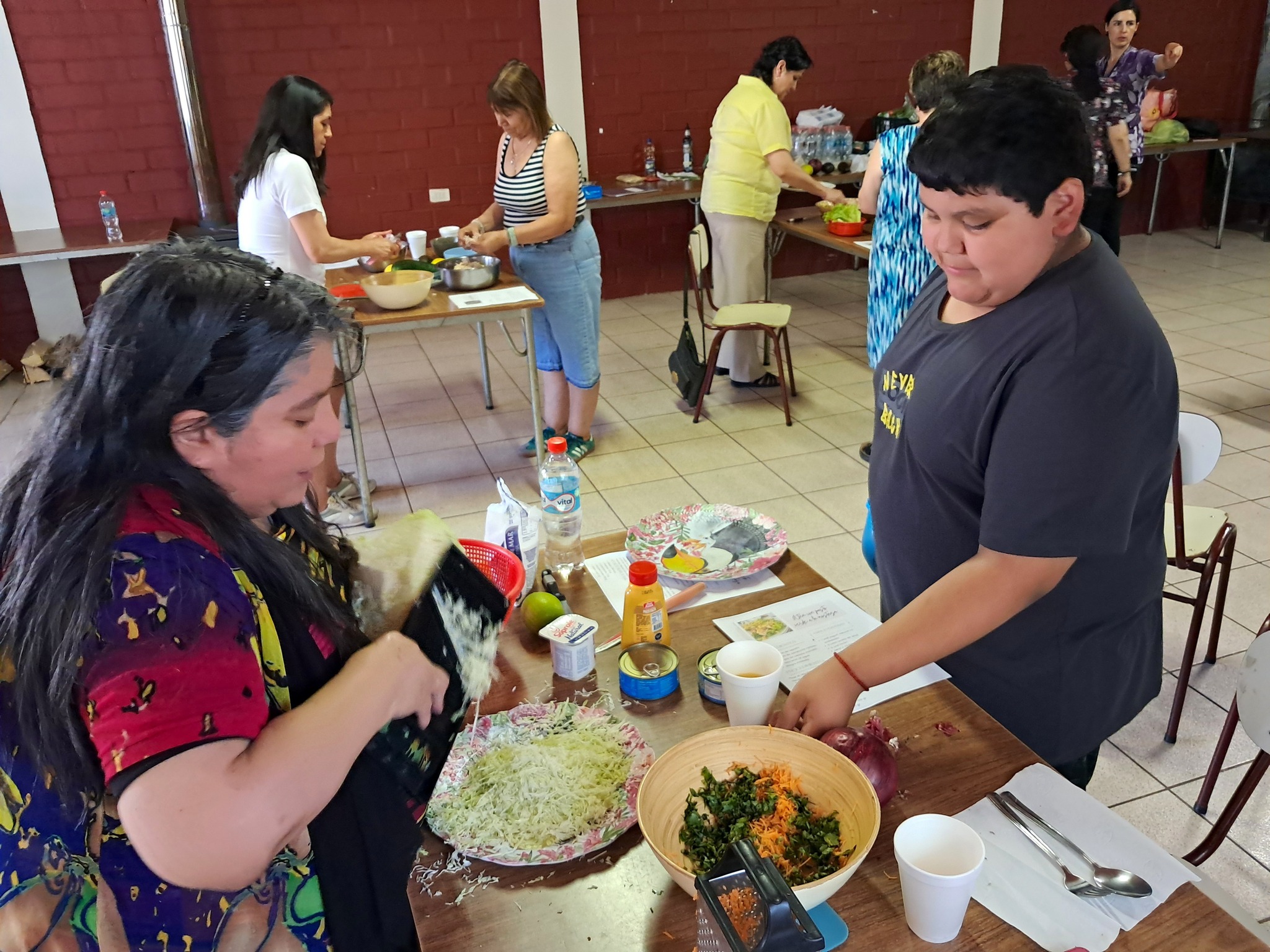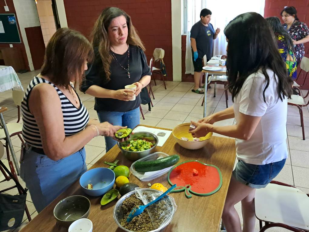 A solicitud de los mismos vecinos y vecinas, esta vez la jornada se orientó a la preparación de almuerzos saludables, con la participación de adolescentes y hasta adultos mayores, quienes trabajaron en base a recetas tales como “Fajitas integrales”, “Ensalada de quínoa con verduras”, “Ceviche de lentejas” y “Atún con pasto verde a la mostaza”.