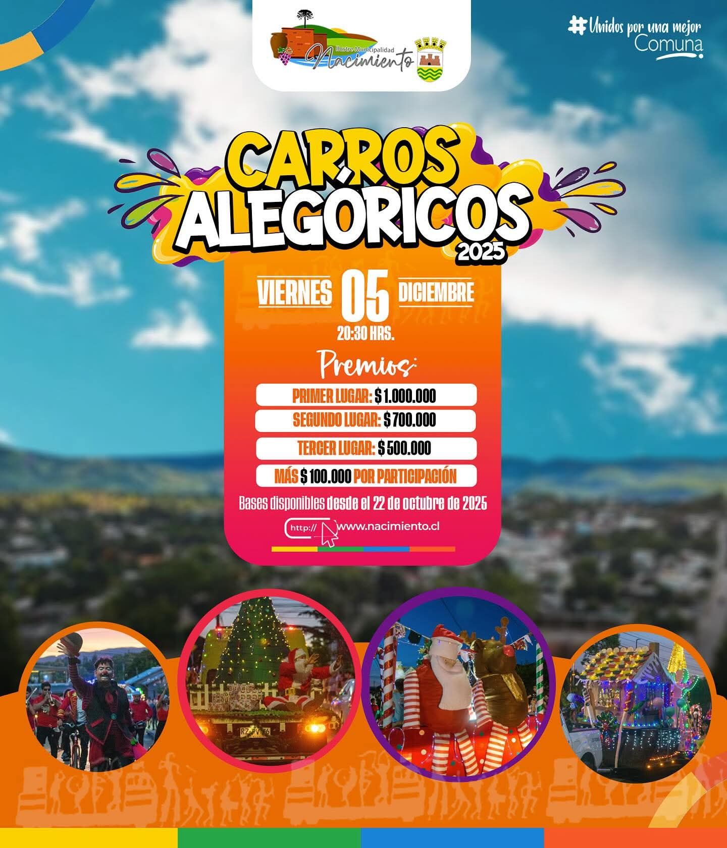 La Ilustre Municipalidad de Nacimiento invita a todas las organizaciones e instituciones -incluyendo a colegios, centros de estudiantes y otras- a ser parte del Concurso de Carros Alegóricos 2025, en el marco del 422° aniversario de nuestra comuna.